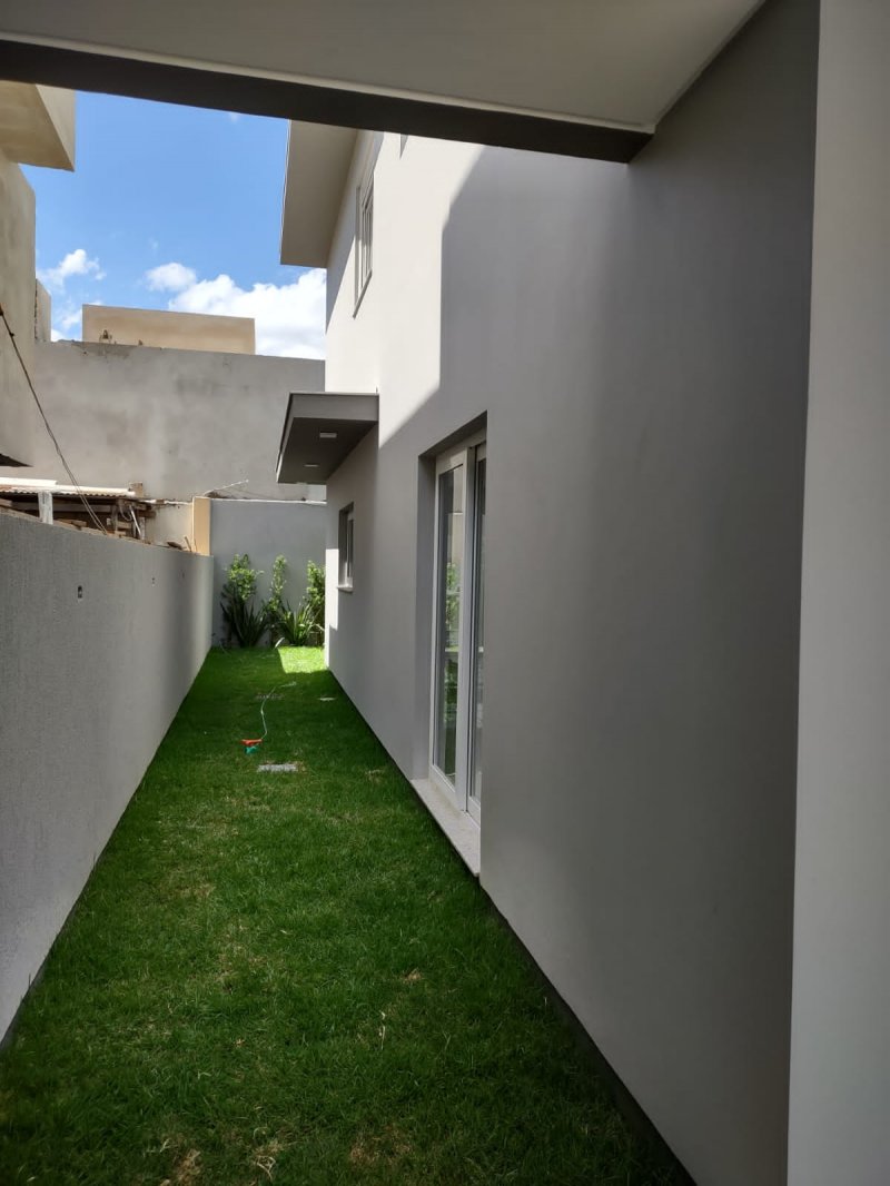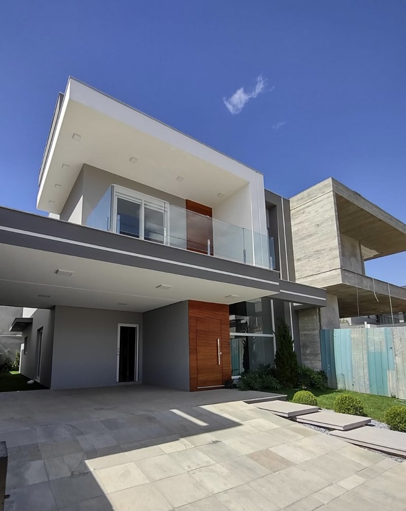 Jardim nos fundos, corredor lateral com paisagismo e gramado, pequeno jardim na parte da frente, fachada imponente com vidro e madeira nobre, vaga para 2 carros cobertos e mais 2 descobertos.