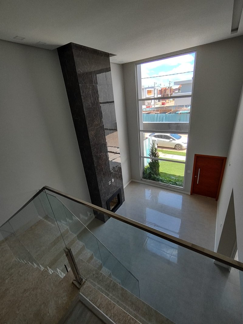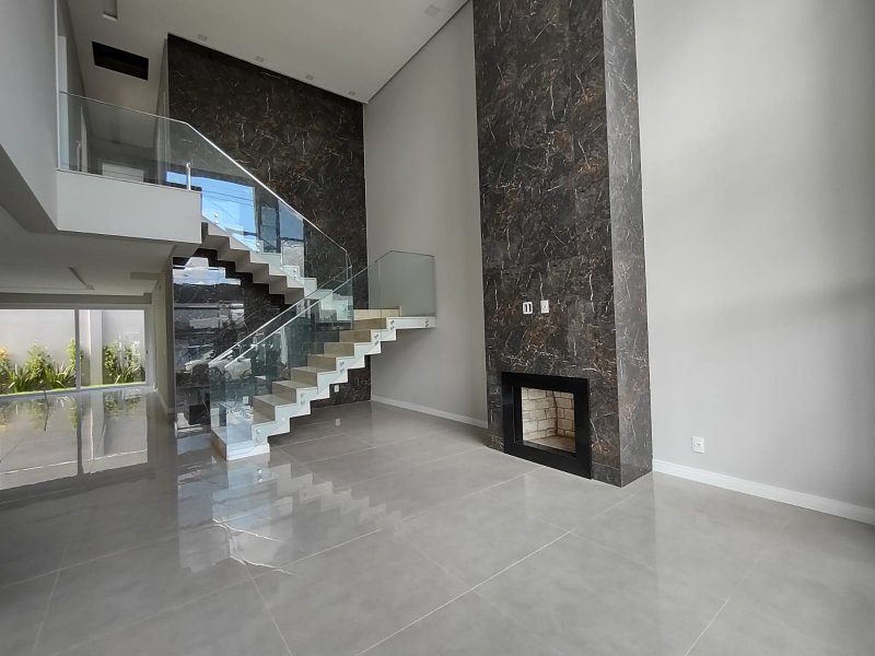 Primeiro pavimento com living amplo com pé direito duplo, belíssima lareira com acabamento em mármore, ambientes integrados com espaço para ilha na cozinha, espaço gourmet com churrasqueira, lavanderia separada e lavabo.