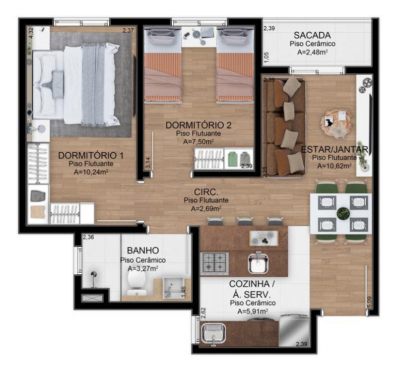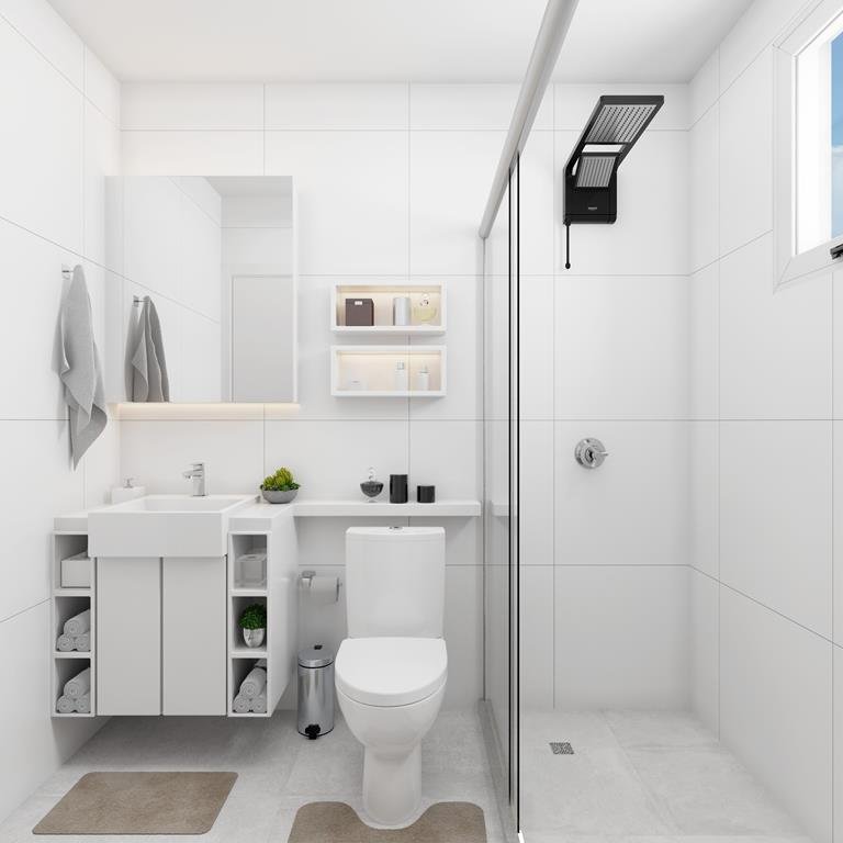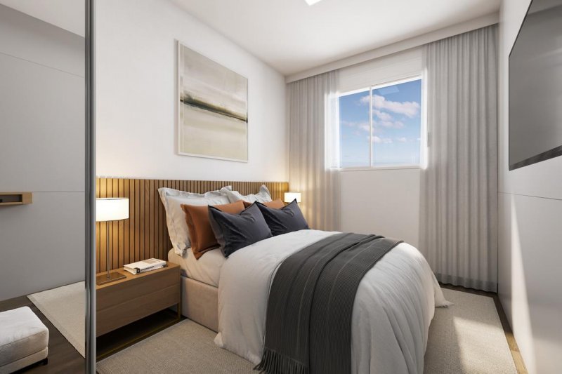 Lançamento de apartamentos com sacada (49,69m²) ou sem sacada (47,07m²), dois dormitórios, com vaga de estacionamento e alguns diferenciais como piso em todo o imóvel, louças e metais sanitários, cozinha e banheiro com azulejos, luminária paflon em todos os ambientes e janelas dos quartos com persianas.