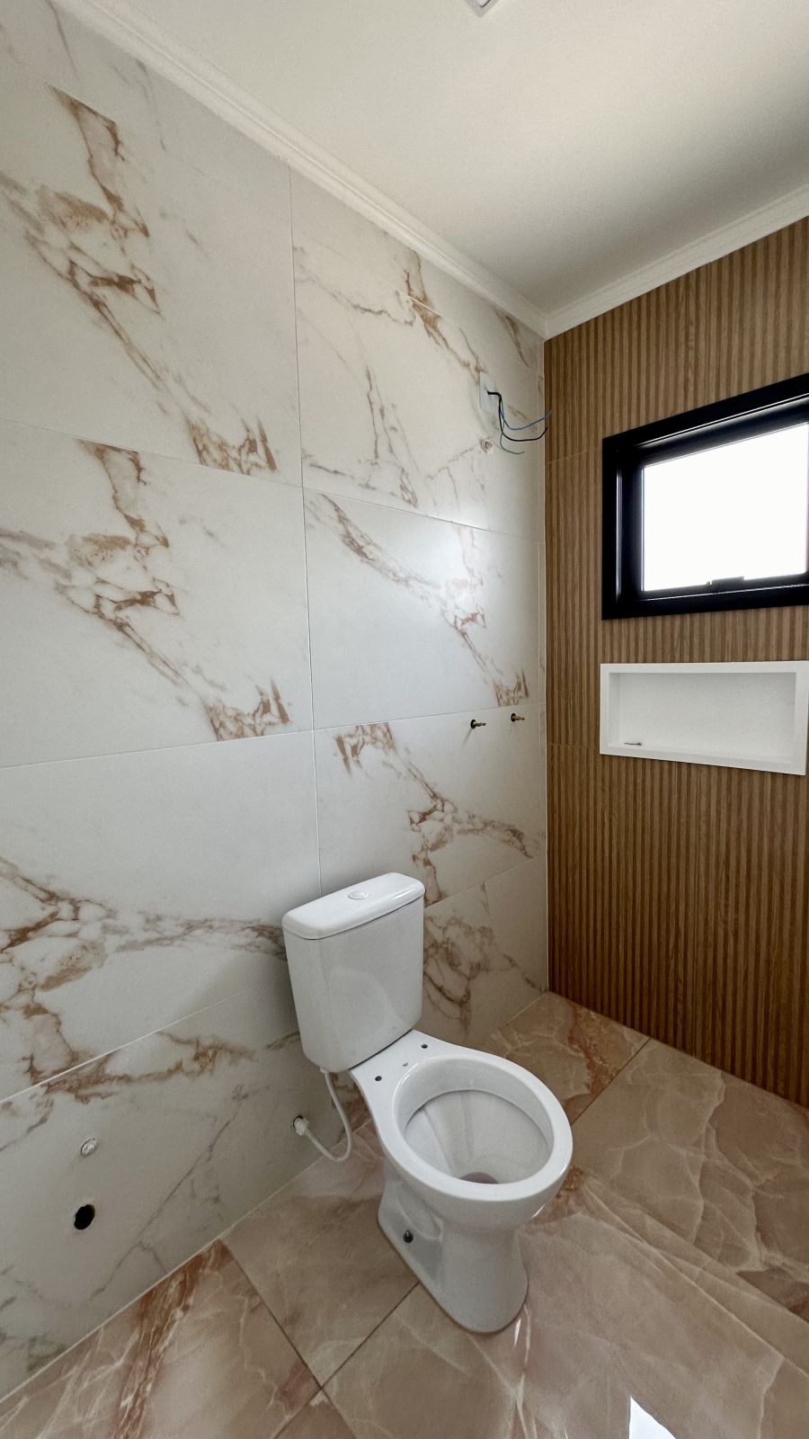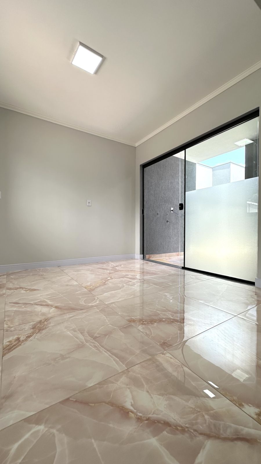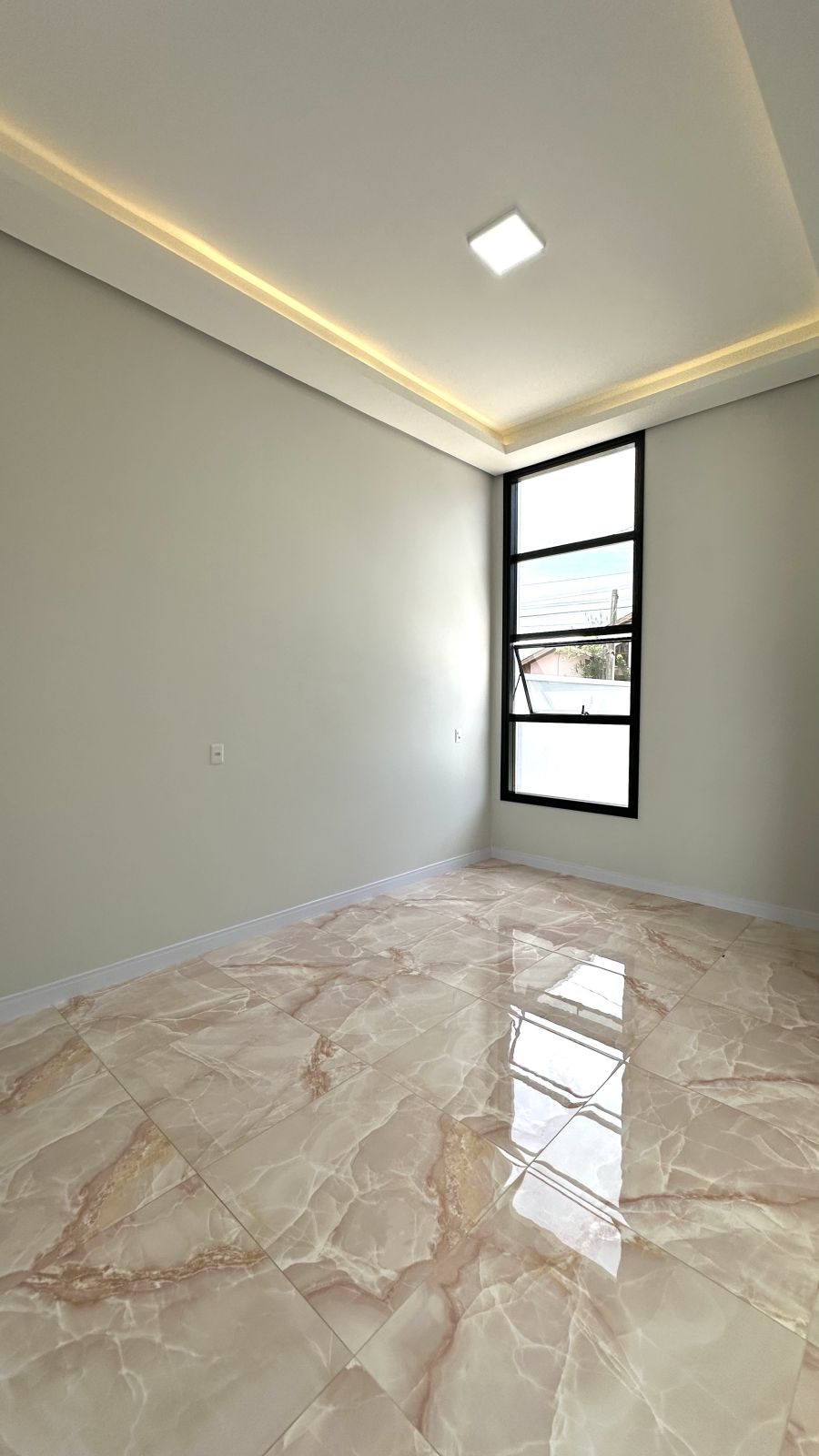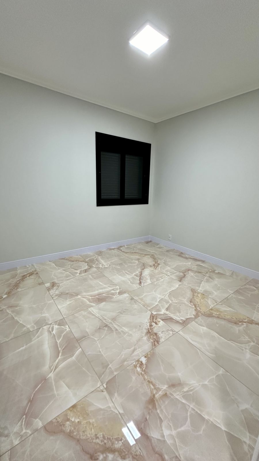 Diferenciais: portão contra-peso amplo, rodapés de PVC, gesso decorado, iluminação completa, aberturas em alumínio e vidro temperado, laje, piso porcelanato, água quente em todas as torneiras, pé direito duplo na sala com vidro espelhado.