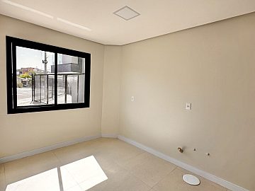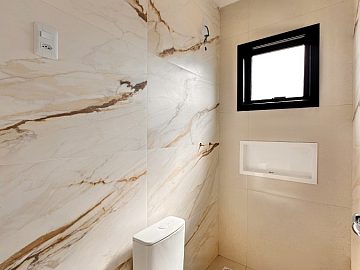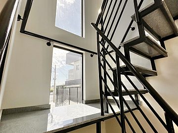 Diferenciais: escada com revestimento em granito, portão de correr, rodapés de PVC, gesso decorado, iluminação completa, aberturas em alumínio e vidro temperado, laje, piso porcelanato e vinílico e espera para água quente em todos os ambientes.