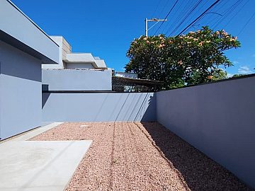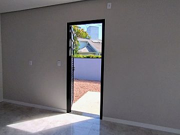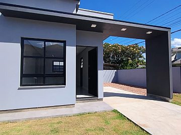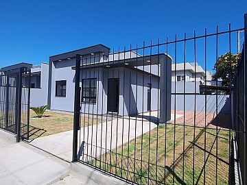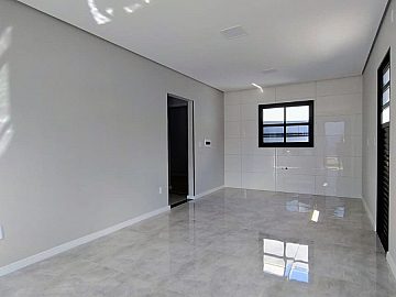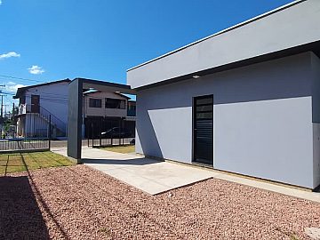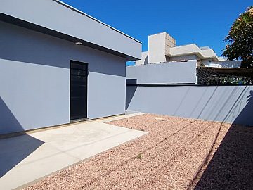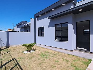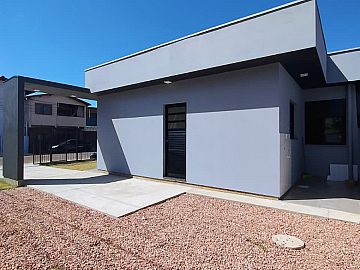 Com 55,84m² construídos, ela conta com 2 dormitórios sendo um suíte, banheiro social, sala e cozinha em ambiente aberto, área de serviço e vaga para dois carros, além de amplo pátio na frente e lateral.